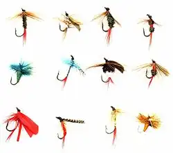 - mouches d'ensemble, qui n'imitent aucun insecte en particulier et néanmoins plaisent aux poissons. Quelques exemples : la "french tricolore", une mouche qui ressemble à un écouvillon, l'"oreille de lièvre", mouche sans grande forme réalisée en poil de lièvre, ou encore la "peute", réalisée avec une plume molle de flanc de cane.