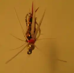 - La dernière du bas de ligne est la mouche de pointe. Bien que non plombée elle aussi, c'est par sa forme et sa densité qu'elle va contribuer à faire couler le bas de ligne : son corps est généralement lisse, gros et ovoïde, et son "hackle" fourni est très incliné sur l'arrière. Traditionnellement noire en Grande-Bretagne, elle peut aussi en France ressembler à certaine nymphe espagnole en pardo dont le corps est jaune et marron.