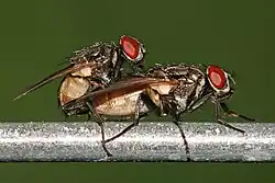 Les mouches adultes en émergent grâce à leur ptiline. Les adultes vivent de deux semaines à un mois dans la nature ou plus longtemps dans les conditions plus confortables d'un laboratoire. Après avoir émergé de la pupe, les mouches cessent de grandir. De petites mouches ne sont pas des mouches jeunes, mais ce sont des mouches qui n'ont pas eu suffisamment de nourriture durant leur stade larvaire.