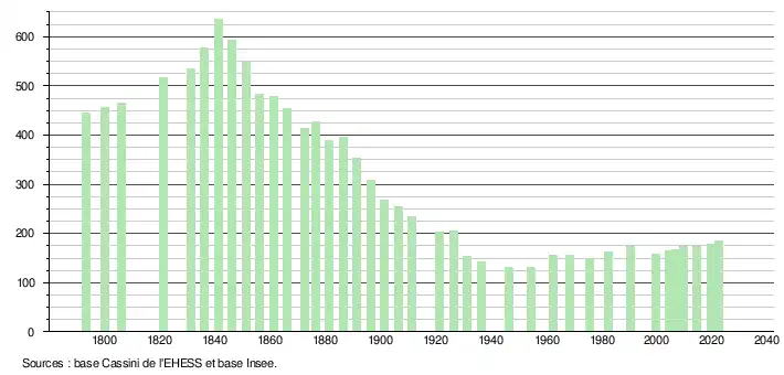 L'évolution du nombre d'habitants est connue à travers les recensements de la population effectués dans la commune depuis 1793. Pour les communes de moins de 10 000 habitants, une enquête de recensement portant sur toute la population est réalisée tous les cinq ans, les populations de référence des années intermédiaires étant quant à elles estimées par interpolation ou extrapolation[20]. Pour la commune, le premier recensement exhaustif entrant dans le cadre du nouveau dispositif a été réalisé en 2004[21].