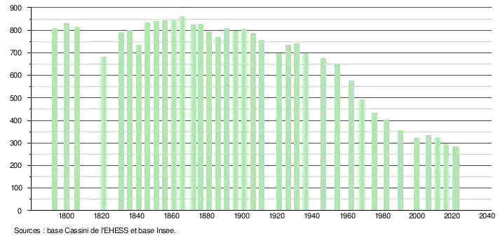 L'évolution du nombre d'habitants est connue à travers les recensements de la population effectués dans la commune depuis 1793. Pour les communes de moins de 10 000 habitants, une enquête de recensement portant sur toute la population est réalisée tous les cinq ans, les populations de référence des années intermédiaires étant quant à elles estimées par interpolation ou extrapolation[31]. Pour la commune, le premier recensement exhaustif entrant dans le cadre du nouveau dispositif a été réalisé en 2006[32].