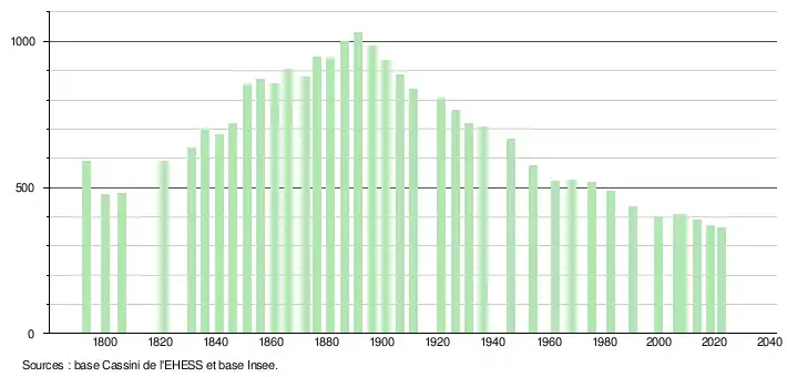 L'évolution du nombre d'habitants est connue à travers les recensements de la population effectués dans la commune depuis 1793. Pour les communes de moins de 10 000 habitants, une enquête de recensement portant sur toute la population est réalisée tous les cinq ans, les populations de référence des années intermédiaires étant quant à elles estimées par interpolation ou extrapolation[29]. Pour la commune, le premier recensement exhaustif entrant dans le cadre du nouveau dispositif a été réalisé en 2008[30].
