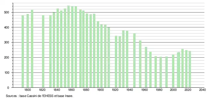 L'évolution du nombre d'habitants est connue à travers les recensements de la population effectués dans la commune depuis 1793. Pour les communes de moins de 10 000 habitants, une enquête de recensement portant sur toute la population est réalisée tous les cinq ans, les populations de référence des années intermédiaires étant quant à elles estimées par interpolation ou extrapolation[24]. Pour la commune, le premier recensement exhaustif entrant dans le cadre du nouveau dispositif a été réalisé en 2007[25].