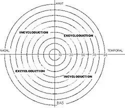 - Incycloduction - Excycloduction : pour les rotations autour de l'axe du regard, selon que la rotation se fait vers le nez ou vers les tempes. (On dit aussi cyclotorsion au lieu de cycloduction).