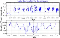 Deux courbes de lumière en bande visible de Mu Geminorum, adaptée de Percy et al. (2001)[16]. Celle du haut montre la variabilité à long terme, celle du bas montre la variabilité à plus court terme.