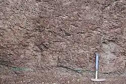 Un mudstone est une roche sédimentaire siliciclastiques qui contient un mélange de particules de la taille du silt et de l'argile (au moins 1/3 de chacune)[10].