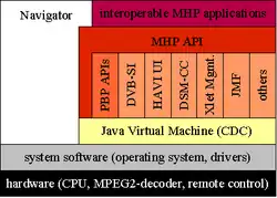 MHP (Multimedia Home Platform) est une norme créée par le consortium DVB pour la télévision interactive[1]. MHP permet la réception et l'exécution d'applications interactives en Java sur la télévision. Les applications de télévision interactive sont envoyées sur un canal de diffusion, avec les flux audio et vidéo. Il peut s'agir de services d'information, de jeux, d'application de vente à distance, ... Les applications MHP peuvent utiliser un canal de retour utilisant le protocole internet (IP).