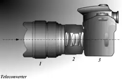Un multiplicateur de focale est constitué d'un ensemble de lentilles majoritairement divergentes (en général 7 lentilles sur un bon doubleur). Positionné entre l'objectif et le boîtier, il écarte les rayons lumineux, de telle sorte que la partie centrale de l'image initiale est projetée agrandie sur la surface sensible. Il agit donc comme le bloc divergent d'un télé-objectif.