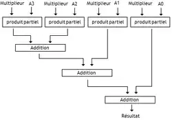 Au lieu d'additionner les produits partiels un par un, il est aussi possible de les effectuer en parallèle. Il suffit d'utiliser autant d'additionneurs et de circuits de calcul de produits partiels qu'il y a de produits partiels à calculer. On peut ainsi calculer tous les produits partiels en parallèle, et effectuer les additions avec un ensemble d'additionneurs reliés en série. Généralement, ce sont des additionneurs à propagation de retenue qui sont utilisés dans ce type de circuits. L'usage d'additionneurs plus évolués augmenterait beaucoup trop la quantité de portes logiques utilisée par le circuit final, pour un gain en performance assez faible.