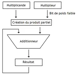 Au tout début de l'opération, le multiplieur et le multiplicande sont stockés dans des registres, et l'accumulateur stockant le résultat est initialisé à zéro. Puis, à chaque cycle d'horloge, le multiplieur va calculer le produit partiel à partir du bit de poids faible du multiplieur, et du multiplicande. Ce calcul du produit partiel est un simple ET entre chaque bit du multiplicande, et le bit de poids faible du multiplieur. Ce produit partiel est alors additionné au contenu de l'accumulateur. À chaque cycle, le multiplieur est décalé d'un cran vers la droite, afin de passer au bit suivant (pour rappel, on effectue la multiplication du multiplicande par un bit du multiplieur à la fois). Le multiplicande est aussi décalé d'un cran vers la gauche.