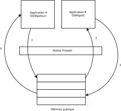 Il est utilisé pour protéger les applications au niveau de la machine virtuelle, permettant ainsi de filtrer les actions malveillantes, comme des instructions illégales ou des lectures de données non autorisées[26]. Il est basé sur un système de délégation : l'application cliente est le déléguant alors que l'application serveur est le délégué et fonctionne de la manière suivante[28],[29] (schéma):