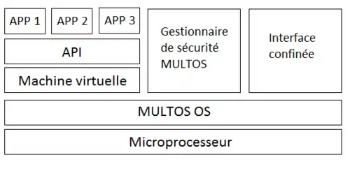 MULTOS s'exécute sur une architecture similaire aux cartes MASCs[3]. Elle se compose d'un microprocesseur sur une puce en silicium permettant ensuite d'ajouter plusieurs fonctionnalités[7]. Elle est dotée d'un système d'exploitation qui permet un accès sécurisé ainsi que le contrôle de la puissance de la puce[7]. Une machine virtuelle permet le chargement et l'exécution des applications[7]. Finalement, un gestionnaire de cartes permet de contrôler la sécurité durant le chargement et la suppression d'applications[7](schéma) :
