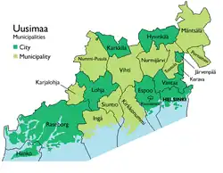 Espoo, Hanko, Helsinki, Hyvinkää, Järvenpää, Karkkila, Kauniainen, Kerava, Lohja, Raseborg et Vantaa ont le statut de villes.