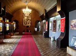 Le corps principal du complexe est un grand palais de style gothique stalinien, créé en 1951 en apparence comme un musée de l'histoire du socialisme, mais qui devait clairement devenir un mémorial pour Staline, décédé en 1953. Les pièces exposées sont réparties en six salles, par ordre chronologique, et comprennent de nombreux objets ayant appartenu réellement ou prétendument à Staline, notamment du mobilier de bureau, des effets personnels et des cadeaux qu’il a reçus au fil des ans. Il existe également de nombreux documents, photographies, peintures et articles de journaux. La présentation se termine par l’un des douze exemplaires du masque mortuaire de Staline.
