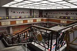 À gauche, le niveau supérieur donnant sur la cour ; à droite, des vitrines. On aperçoit de grandes photographies de paysages ainsi qu’une vieille embarcation tibétaine. | ||