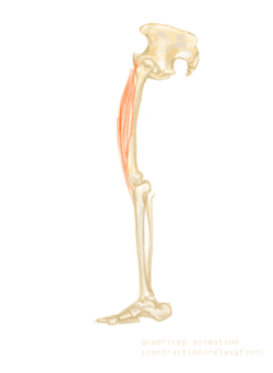 Actions du quadriceps : il est fléchisseur de hanche (uniquement le droit fémoral) mais surtout extenseur du genou (pas sur l'animation). Il permet la stabilité du genou lors de la phase unipodal de la marche.