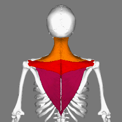 - en avant avec les muscles spinaux, grand dorsal, supra-épineux, dentelé postérosupérieur, rhomboïdes, élévateur de la scapula, splénius et semi épineux.