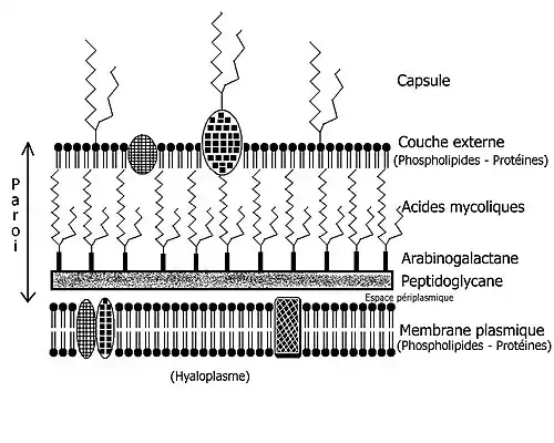 Le squelette de la paroi est composé de peptidoglycane (appelé aussi muréine) relié de façon covalente à un hétéroside : l'arabinogalactane, lui-même estérifié par des acides mycoliques, acides gras particuliers à très longue chaîne. Ils forment alors des cires.