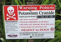 Panneau annonçant à l'avance une campagne d'empoisonnement au cyanure de potassium, visant l'éradication de l'opossum d'Australie introduit en Nouvelle-Zélande, devenu invasif et supposé être le vecteur le plus important du bacille responsable de la diffusion de la TB chez les bovins (également introduits dans le pays par les colons)