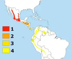 On la trouve de façon disjointe dans les forêts humides d'altitude du Mexique, d'Amérique centrale, des Andes boréales, de la cordillère de la Costa (Venezuela) et les tepuis. L'espèce possède un ventre rougeâtre dans la partie septentrionale de son aire de répartition.
