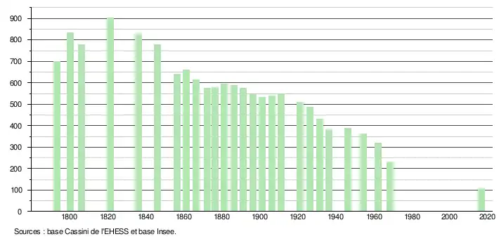 L'évolution du nombre d'habitants est connue à travers les recensements de la population effectués dans la commune depuis 1793. Pour les communes de moins de 10 000 habitants, une enquête de recensement portant sur toute la population est réalisée tous les cinq ans, les populations de référence des années intermédiaires étant quant à elles estimées par interpolation ou extrapolation[3]. Pour la commune, le premier recensement exhaustif entrant dans le cadre du nouveau dispositif a été réalisé en 2007[4].