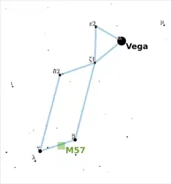 M57 est relativement facile à localiser. On trouve d'abord l'astérisme du Triangle d'été constitué des trois étoiles les plus brillantes des constellations de l'Aigle (Altaïr), du Cygne (Deneb) et de la Lyre (Véga). M57 est situé entre les étoiles Beta et Gamma Lyrae à environ un tiers de la distance à partir de Beta