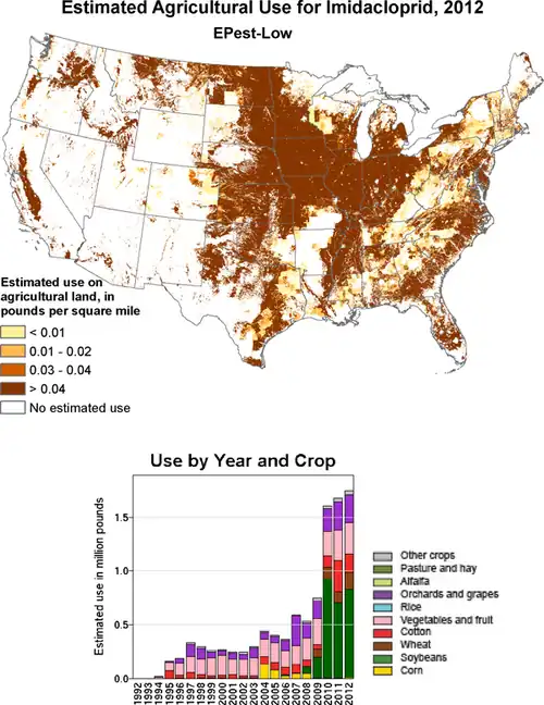 De plus, comme l'enrobage des semences s'est généralisé à de très nombreuses régions, de vastes surfaces ont été cultivées avec 100 % de graines traitées ; or, on a montré qu'une partie de la matière active de l'enrobage n'est jamais absorbée par la plante, ce qui se traduit in fine par une utilisation globale d'insecticides qui a fortement augmenté. Ainsi, au Canada, la quantité de terres cultivées traitées aux néonicotinoïdes a augmenté de 30 % en trois ans (de 2009 à 2012)[35] (taux probablement sous-estimé). Avant le traitement des semences aux néonicotinoïdes, seuls 35 % du maïs américain relevait des insecticides (contre 100 % dans les cultures de 2017 à base de semences prétraitées aux néonicotinoïdes)[36].