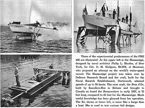 Dans les années 1950 et 1960, la Marine royale canadienne a commencé à concevoir des hydroptères navals expérimentaux[19]:
