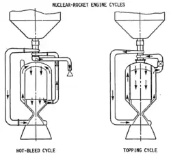 Plusieurs solutions permettaient d'envisager néanmoins le cycle amont avec un réacteur NERVA. On préconisa par exemple d'ensemencer le réflecteur avec du combustible nucléaire afin d'augmenter la température périphérique du réacteur[10]. La solution la plus citée consiste à diviser le flot d'hydrogène sortant des pompes : une partie passe dans le circuit de régénération et ne prélève à la tuyère que la quantité de chaleur nécessaire à la préservation des matériaux ; l'autre partie est envoyée dans le cœur du réacteur par le circuit des tubes de support du combustible[9],[11] puis vers les turbopompes ; l'alimentation est alors implémentée par l'augmentation de la puissance du réacteur, sans incidence sur la poussée ou l'impulsion.
