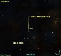 NGC 2438 est située à environ 5,2 degrés presque directement au sud de l'étoile Alpha Monocerotis.