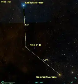 NGC 6134 est situé à environ 1,5 degré presque directement au sud de l'étoile Epsilon Normae et à 1,6 degré de Gamma2 Normae.