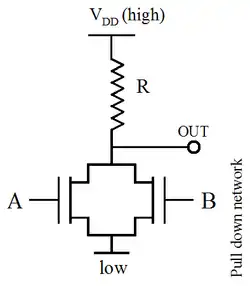A titre d'exemple, on présente à droite de façon schématisée une porte NOR implémentée en NMOS. Si l'entrée A ou l'entrée B est haute (logique 1 = Vrai), le transistor MOS respectif agit comme une très faible résistance entre la sortie et l'alimentation négative, forçant la sortie à être basse (logique 0 = Faux). Quand les deux entrées A et B sont hautes, les deux transistors conduisent, créant une résistance encore plus faible vers la masse. Le seul cas où la sortie est haute se produit lorsque les deux transistors sont bloqués, ce qui se produit seulement lorsque A et B sont bas, et donc respectent la table de vérité d'une porte NOR :