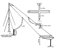 - L'antenne "AH-HFBDS" inclinées de 30° de station professionnelle[11], la puissance de 400 W PEP est à répartir à l’intérieur d'une zone de 1 500 km autour de la station d’émission. Ceci dans la bande 2 à 14 MHz.