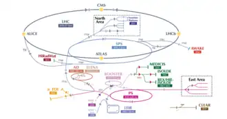 Schéma représentant les différents accélérateurs et expériences du CERN, dont n_TOF (en bas, à gauche).