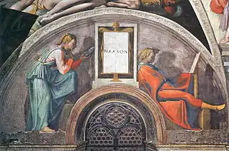 Les lunettes suivent la généalogie du Christ à partir de l'Évangile selon Matthieu. Naasson et sa femme se trouvent dans la première lunette du mur gauche en partant de l'autel ; la lunette est située au-dessus du pendentif du Châtiment d'Haman.