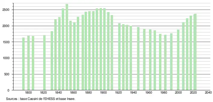 L'évolution du nombre d'habitants est connue à travers les recensements de la population effectués dans la commune depuis 1793. Pour les communes de moins de 10 000 habitants, une enquête de recensement portant sur toute la population est réalisée tous les cinq ans, les populations de référence des années intermédiaires étant quant à elles estimées par interpolation ou extrapolation[18]. Pour la commune, le premier recensement exhaustif entrant dans le cadre du nouveau dispositif a été réalisé en 2006[19].