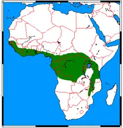 Elle est native d'Afrique équatoriale, attestée et considérée comme résidente dans les pays suivants : Angola ; Bénin ; Burundi ; Cameroun ; République centrafricaine ; Congo ; République démocratique du Congo ; Côte d'Ivoire ; Guinée équatoriale (continentale) ; Gabon ; Gambie ; Ghana ; Guinée ; Guinée-Bissau ; Kenya; Liberia ; Malawi ; Mozambique ; Nigeria ; Rwanda ; Sénégal ; Sierra Leone ; Sud Soudan ; Tanzanie ; Togo ; Ouganda ; Zambie ; Zimbabwe[1].
