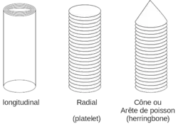 - Arrangement en arêtes de poisson : il n'y a pas de plans de graphène mais des cônes formés par un feuillet de graphène qui sont empilés les uns sur les autres selon l'axe radial des fibres, ce qui leur donne une apparence de structure en arête de poisson quand elles sont regardées dans un microscope électronique à transmission.
