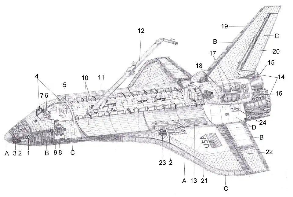 - bouclier thermique : quelque 24 000 tuiles isolantes en carbone composite ou en silice