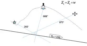 - apporter la correction due au compas utilisé pour obtenir l'azimut vrai (Zv) : Zv = Zc + W ( W est la variation du compas ; s’il s'agit d'un compas gyroscopique, en général cette variation gyroscopique est faible ; dans le cas d'un compas magnétique W = D + δ : somme de la déclinaison magnétique et de la déviation propre au compas) ;