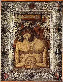 Dans l'art occidental la scène de la lamentation de Marie sur le corps de son fils est appelée par le nom italien Pietà (signifiant pitié, compassion) ; et le corps du Christ émergeant du caisson de son sarcophage, un Christ de douleur ou Christ en homme de douleurs.