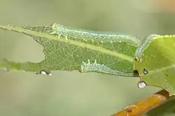 La larve ressemble à une chenille de lépidoptère ; elle a une tête blanche avec des marques brunes, un corps vert, trois paires de vraies pattes à l'avant et sept paires de fausses pattes derrière[1].