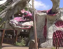 La gare de l'attraction représente le corps de la créature et les endroits où le train passe tout près de la roche évoquent les coups qu'elle donne en essayant de se libérer de l'acier qui la cloue au sol. La teinte rouge des rivières coulant dans les rochers représente son sang. L'attraction est construite dans une immense fosse. Elle représente la zone dans laquelle le monstre a été découvert[12].