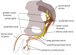 - Le nerf pudendal est indiqué par « Perineal n. » en bas à la gauche ; le nerf périnéal est immédiatement au-dessus.