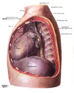Le nerf phrénique gauche croise en arrière la portion horizontale de l'artère pulmonaire gauche puis longe la face latérale gauche du péricarde avec un trajet oblique en avant, et atteint le diaphragme un peu en arrière de la pointe du cœur.