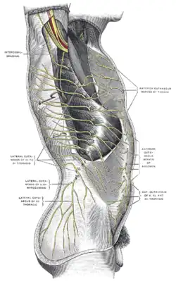 Face latérale droite du tronc montrant les branches cutanées du nerf subcostal