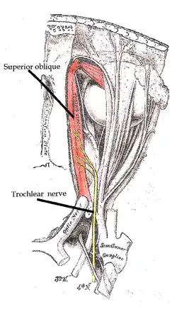 Le nerf trochléaire se compose d'axones moteurs qui innervent un muscle strié squelettique, le muscle oblique supérieur de l'œil. Celui-ci se termine en avant par un tendon qui traverse une anse fibreuse, la trochlée, disposée à la partie antéromédiale de la paroi interne de l'orbite.