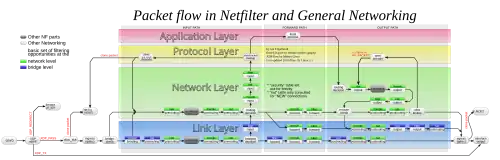 Considérant que ipchains et ipfwadm combinaient le filtrage de paquets et NAT (en particulier les trois types de NAT, appelés le masquage, la transmission de port et la redirection), Netfilter sépare les opérations de paquets en plusieurs parties, décrites ci-dessous. Chacune se connecte à différents points d'accès dans les accroches Netfilter pour inspecter les paquets. Les sous-systèmes de connexion suivr (Connection Tracking) et de NAT sont plus généraux et plus puissants que les versions inférieures dans ipchains et ipfwadm.