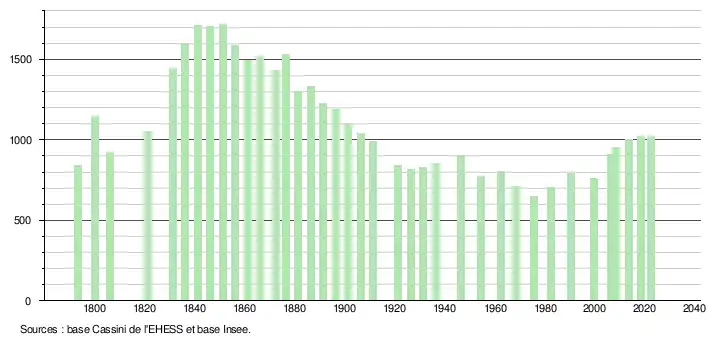 L'évolution du nombre d'habitants est connue à travers les recensements de la population effectués dans la commune depuis 1793. Pour les communes de moins de 10 000 habitants, une enquête de recensement portant sur toute la population est réalisée tous les cinq ans, les populations de référence des années intermédiaires étant quant à elles estimées par interpolation ou extrapolation[19]. Pour la commune, le premier recensement exhaustif entrant dans le cadre du nouveau dispositif a été réalisé en 2008[20].