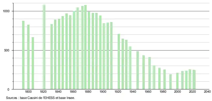 L'évolution du nombre d'habitants est connue à travers les recensements de la population effectués dans la commune depuis 1793. Pour les communes de moins de 10 000 habitants, une enquête de recensement portant sur toute la population est réalisée tous les cinq ans, les populations de référence des années intermédiaires étant quant à elles estimées par interpolation ou extrapolation[21]. Pour la commune, le premier recensement exhaustif entrant dans le cadre du nouveau dispositif a été réalisé en 2006[22].